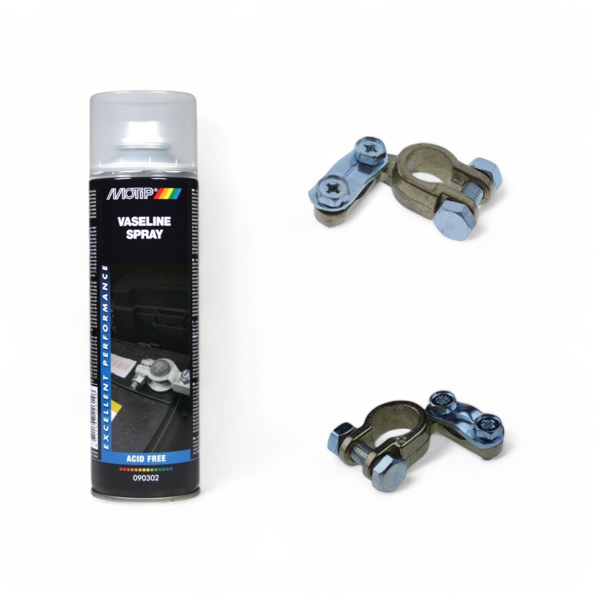 Deze actie omvat een uitgebreide set met 20 aluminium I-type accuklemmen, geschikt voor 12-24V systemen en kabeldoorsneden van 10 tot 70 mm², inclusief zowel positieve als negatieve klemmen, samen met een 500 ml spuitbus MOTIP Vaseline Spray voor optimale bescherming en onderhoud.