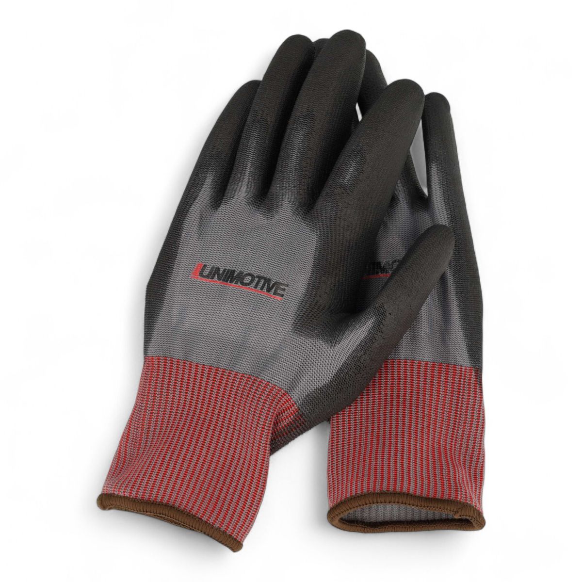 Zwarte naadloze nylon handschoen met een zwarte polyurethaan coating.